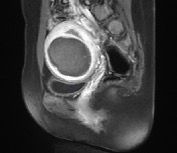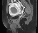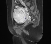 Figure 4. (A-D). Contrast-enhanced MRI obtained from a 35-year old patient with uterine fibroid. (A). Pre-HIFU MRI showed a significant enhancement of a uterine fibroid located at the anterior wall of the uterus, and the size of the fibroid was 5.6 cm x 4.6 cm x 4.9 cm; (B).1-day post-HIFU MRI showed no enhancement of the treated fibroid, the uterine fibroid was completely ablated; (C). 4-month post HIFU MRI showed the size of the treated fibroid reduced to 5.0 cm x 4.3 cm x 4.2cm, the shrinkage was 28.5%; (D). 10-month post-HIFU MRI showed the size of the treated fibroid reduced to 3.5 cm x 3.0 cm x 3.2cm, and the shrinkage was 73.4% compared to baseline. Images courtesy Prof. Zhang Lien.