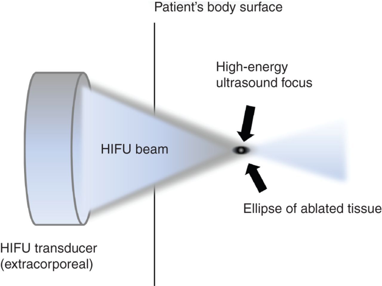 High intensity focused ultrasound (HIFU) tissue ablation is based upon the excellent penetrability of ultrasonic waves in the human body and the ability to focus those waves on the targeted tissue. The temperature of the tissue is raised to approximately 65℃ (149º Fahrenheit) resulting in coagulative necrosis as the mechanical effect of the ultrasound waves is converted into heat (Figure 1). Lynn et al. first introduced the conception of non-invasive HIFU treatment in the 1940s. However, successful clinical applications awaited the development of suitable techniques with which to target [Lynn, 1942]. Now, HIFU is performed under either ultrasound or MRI guidance allowing the precise targeting that, minimizes or avoids trauma to the adjacent or normal surrounding tissue.